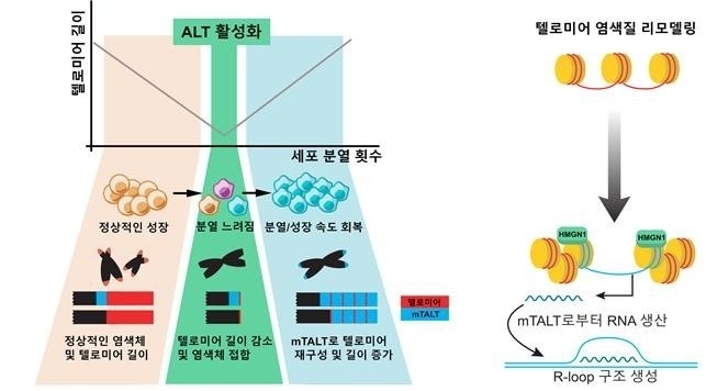 텔로미어는 염색체 끝에 위치한 보호막으로, 세포가 분열할 때마다 조금씩 짧아집니다. 이 보호막이 완전히 닳아버리면 세포는 분열을 멈추고, 노화 또는 세포사멸이 일어납니다.
